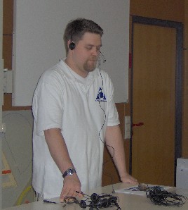 Sebastian Engel demonstriert die Funktionsweise eines Headsets, dem typischen Arbeistgerät eines Mitarbeiters bei AOL. |